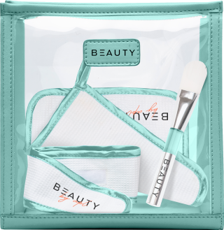 Теперь любимые средства будут храниться в стильной прозрачной косметичке! Полотенце, кисточка, повязка входят в комплект.